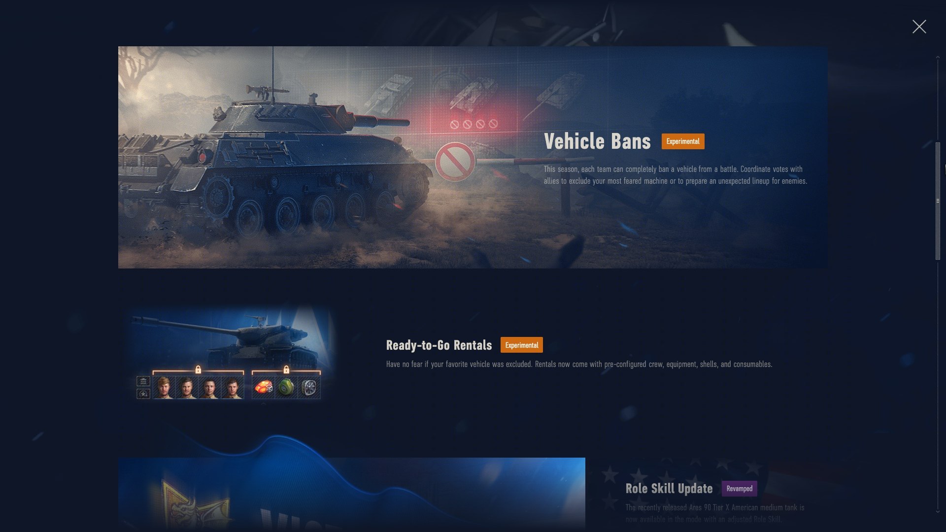 - Zakazy dla pojazdów: Podczas odliczania przed bitwą gracze mogą zagłosować nad wykluczeniem któregoś pojazdu własnej drużyny. Wynik jest określany większością głosów. Jeśli jest remis dwóch lub większej liczby pojazdów, zostanie wylosowany jeden z nich. Gracz w wykluczonym pojeździe będzie poproszony o wybranie innego. Pojazdy z największą liczbą głosów w każdej drużynie zostaną z nich wykluczone. Obie drużyny głosują niezależnie i może być tak, że wykluczą ten sam pojazd, różne pojazdy, albo nie wykluczą żadnego.