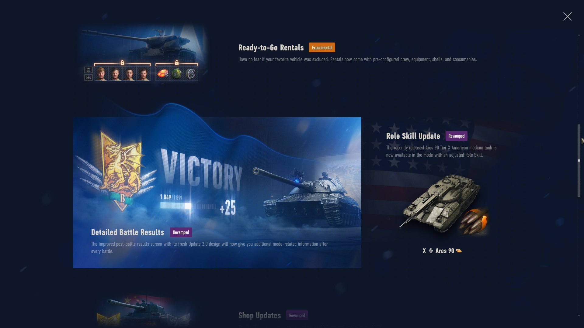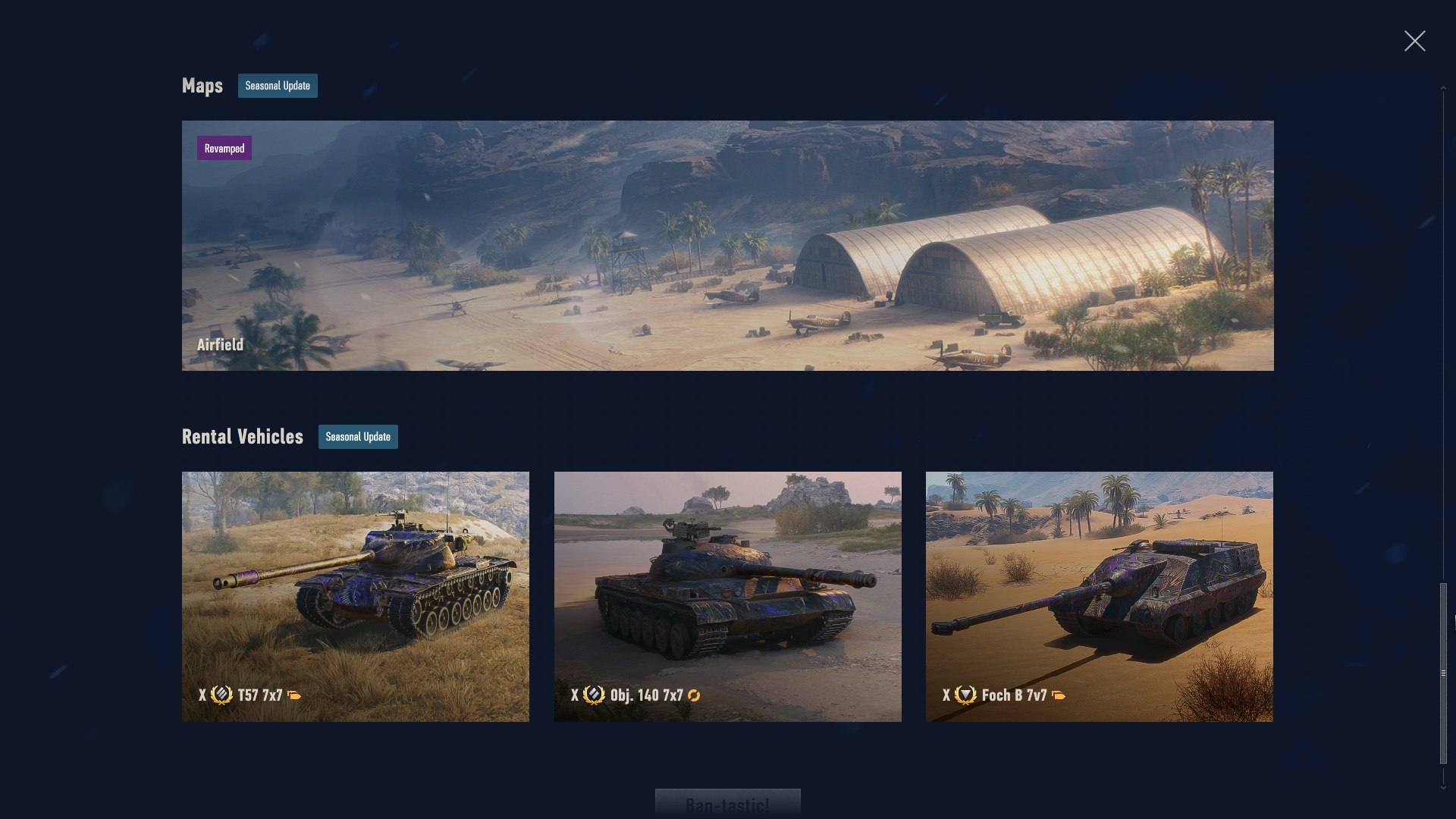 - Wstępnie skonfigurowane pojazdy do wypożyczenia: Object 140 7×7, Foch B 7×7 oraz T57 Heavy 7×7 pojawią się z załogami z czterema atutami, określonym zestawem amunicji oraz zainstalowanym wyposażeniem i materiałami eksploatacyjnymi. Gracze mogą zmienić amunicję, ale nie mogą usunąć wyposażenia czy załogi, ani zmienić atutów jej członków. Materiały eksploatacyjne działają jak wbudowane duże zestawy naprawcze w pojazdach-nagrodach IX poziomu w Przepustce bitewnej.